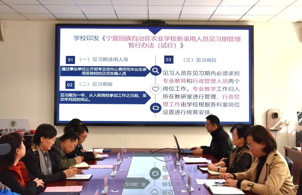 办公室主任郭亮带领新入职教师学习《宁夏回族自治区农业学校新录用人员见习期管理暂行办法》。