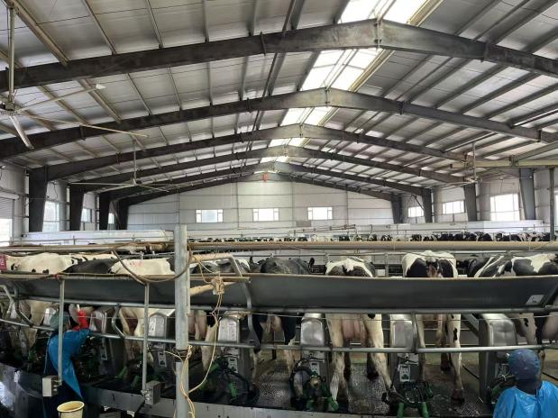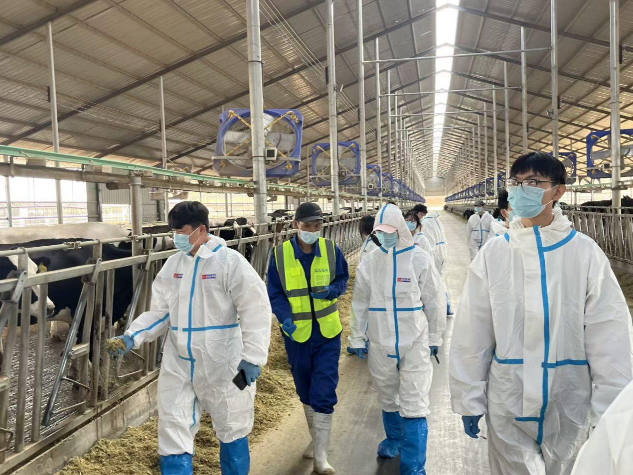 宁夏正元生态农业科技有限公司产业导师对师生一行表示热烈欢迎,并为师生提供了专业讲解与实操指导。师生们先后走进饲料加工车间、标准化牛舍及现代化挤奶大厅,系统了解现代化奶牛养殖的全链条流程:在饲料加工车间,通过观摩科学配比、标准化存储等环节,学生们认识到营养管理是保障奶牛健康与乳源品质的核心基础;在犊牛、育成牛、青年牛及泌乳牛分阶段饲养区,技术人员结合奶牛不同生长阶段的生理特点,详细讲解标准化饲养管理要点与动物福利理念,帮助学生建立对奶牛生命周期的直观认知。学生们凝神观察、不时提问,现场学习氛围浓厚。