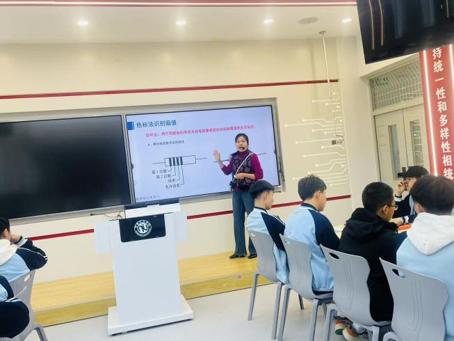 10月22日,丁朝钰老师以“常用电子元件识别与检测”为主题,通过实物演示、PPT讲解,清晰剖析电阻、电容、二极管的外形特征及参数读取方法。课程教学采用“微课+示范”模式,精准突破教学难点。“元件寻宝分拣赛”环节,学生在3分钟内快速分拣混装元件,充分调动学习积极性。课程巧妙融入思政教育,将工匠精神细化为“操作规范、读数精准”的具体要求,通过岗位案例让学生感受技能价值,培养严谨态度与协作意识。